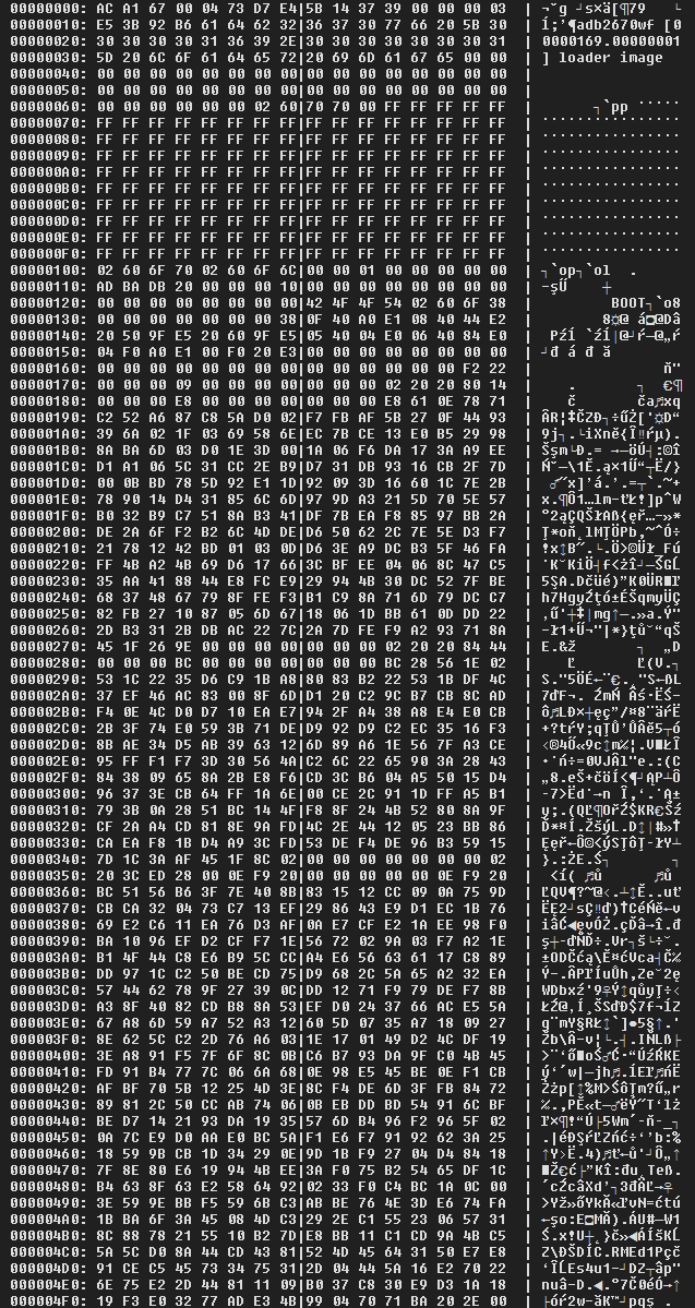 The loader and download images were probably the most interesting. Here's a hexdump of one of them: