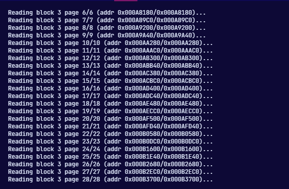 The following day, I wrote a simple page reading snippet - it reads 2112 bytes (2048 + OOB data) from a specified address: