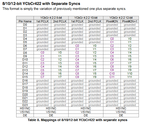 If that was the case, then it would be almost impossible to implement the mod I wanted. Reading the datasheet further confirmed my suspicion - the only used pins were HSYNC, VSYNC, DE, PCLK and D8..D15 - this matched the YCbCr 4:2:2 8-bit mode.