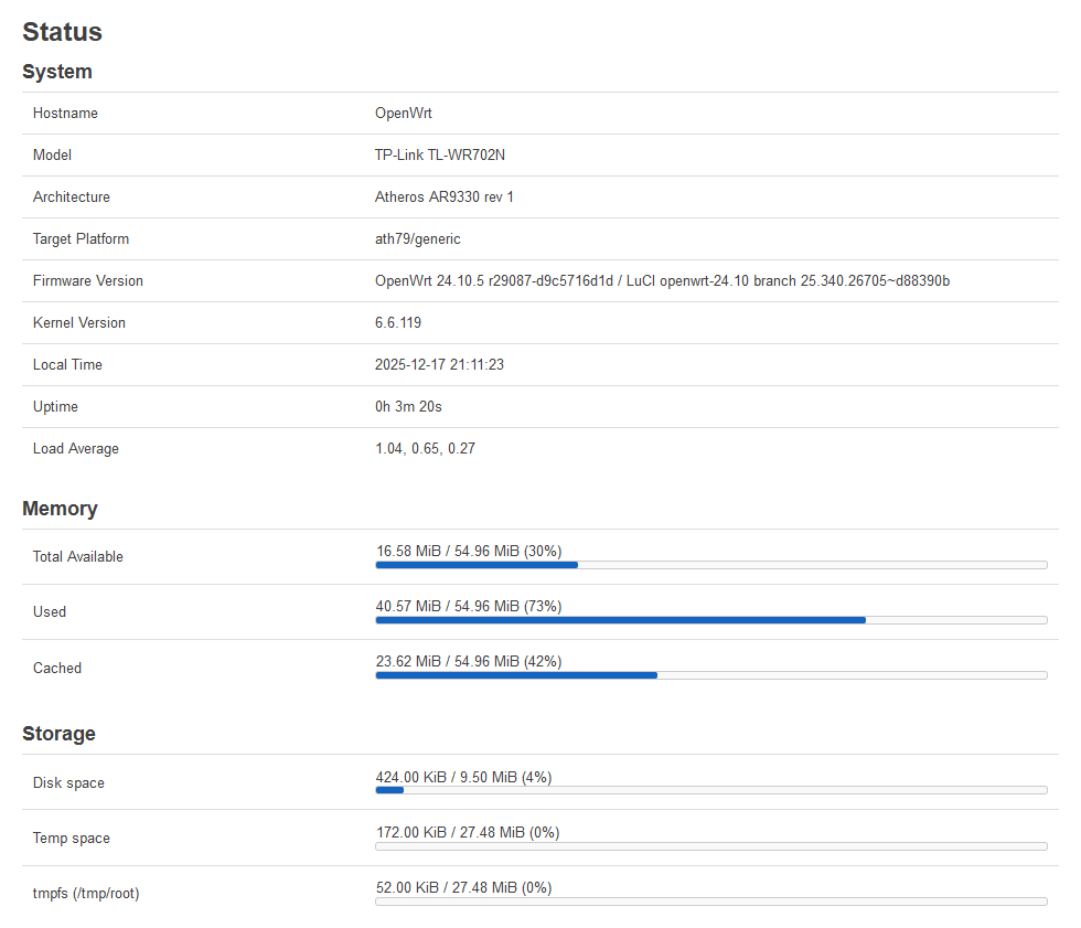 Thankfully, the TL-WR703N page contains some instructions about modding the device to add more flash and RAM. This allows to increase the storage to 16 MiB, as well as having at most 64 MiB of RAM - now, that's already plenty!